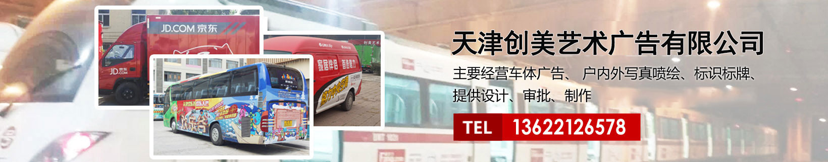 天津創(chuàng)美藝術(shù)廣告有限公司主要經(jīng)營(yíng)車體廣告、 戶內(nèi)外寫真噴繪、標(biāo)識(shí)標(biāo)牌、提供設(shè)計(jì)、審批、制作、發(fā)布的服務(wù)。